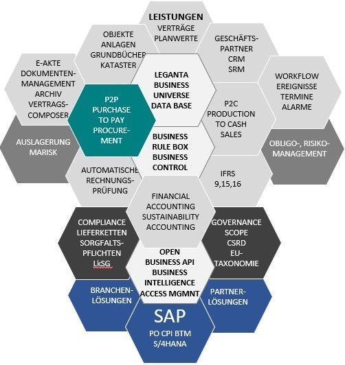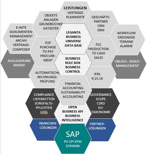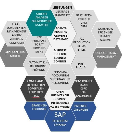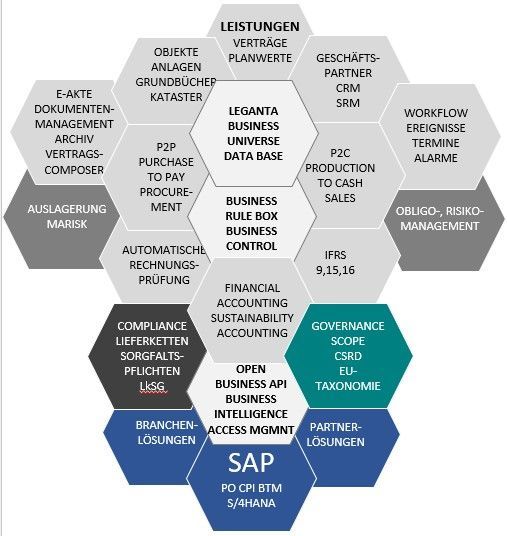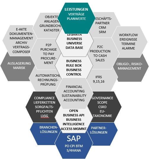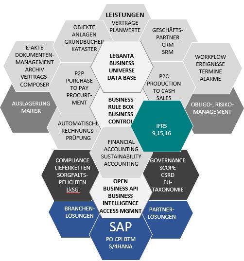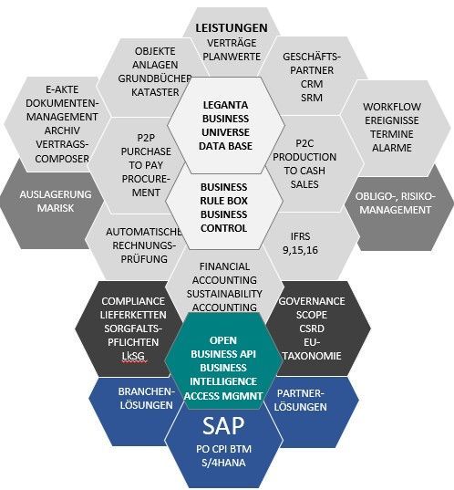 Grundlage ist das LEGANTA 360° Leistungskonzept für alle Geschäftsprozesse und Geschäftsdaten mit Mengen und Werten